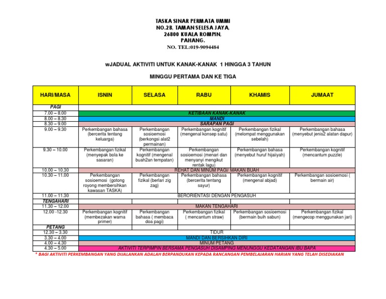 Jadual aktiviti harian kanak-kanak di taska. Selain itu juga rutin ini bertujuan untuk memaklumkan ibubapa agar lebih memahami dan jelas dengan. 3124 Jadual pemakaian baju seragam bagi kedua-dua TASKA playgroup dan TADIKA adalah pada setiap hari isnin rabu dan jumaat. Memudahkan guru menyediakan keperluan bagi aktiviti.