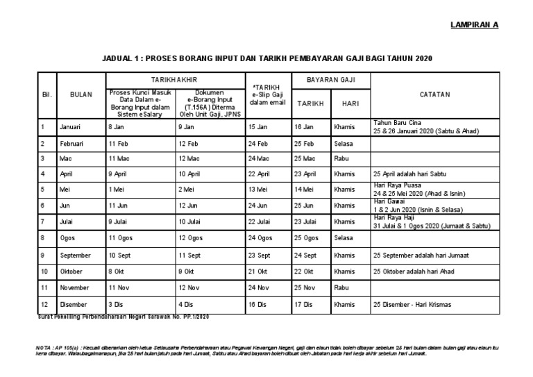 Bagi menghargai kerja keras dan dedikasi penjawat awam Sarawak sepanjang tahun saya dengan gembiranya mengumumkan bonus satu setengah bulan gaji pokok atau minimum RM2000. Berikut adalah lampiran jadual pembayaran gaji bulanan kakitangan awam penjawat awam bagi tahun 2020 mengikut tarikh gaji sepertimana yang telah ditetapkan dalam surat pekeliling Akauntan Negara Malaysia. 16 1 2020 isnin tahun baru cina februari.